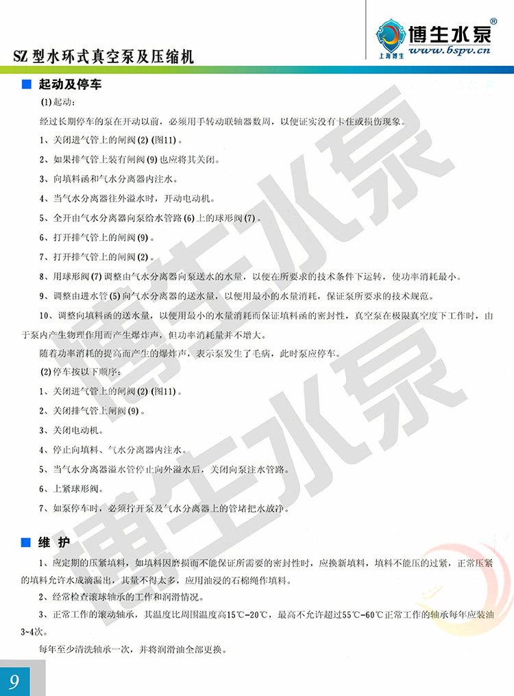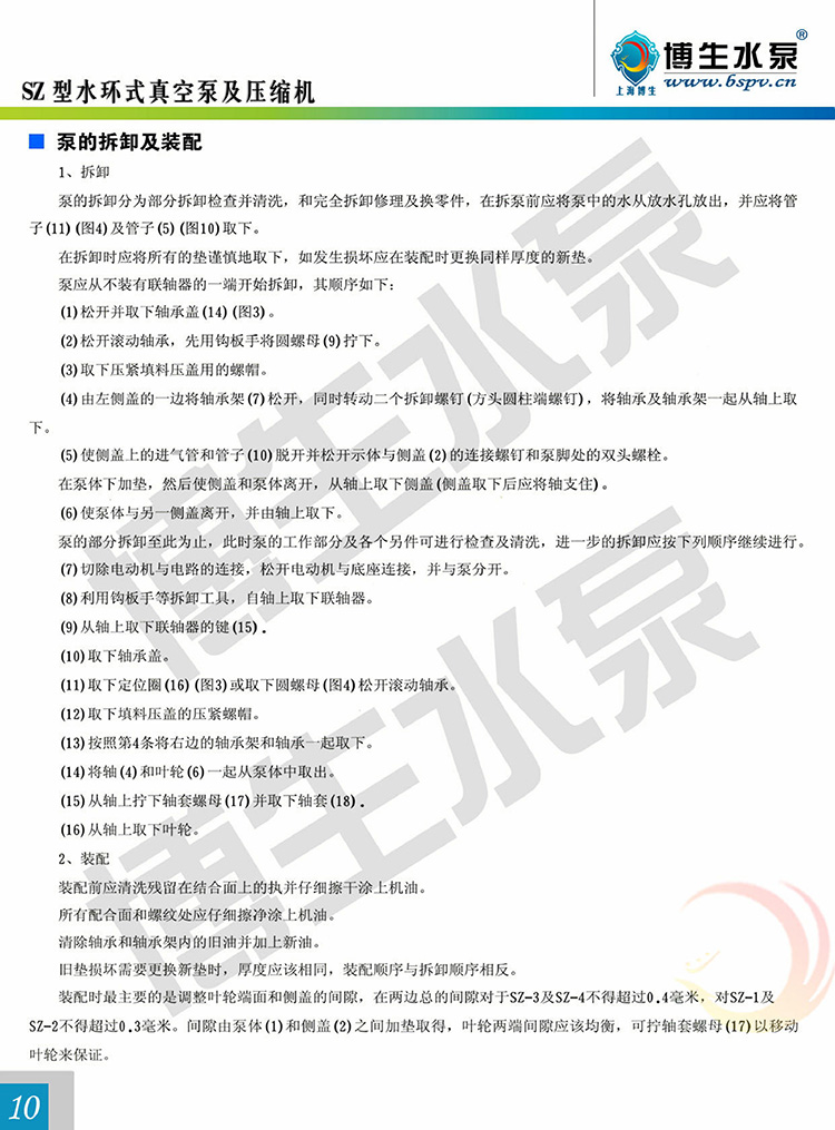 SZ型有SZ-1、SZ-2、 SZ-3及 SZ-4四種規(guī)格,泵所形成的最大真空度分別在86~95%之間。SZ-1及 SZ-2所能形成的最大壓力為1.0~1.4公斤/厘米2,SZ-3及SZ-4在所配電動機(jī)功率容許下的最大